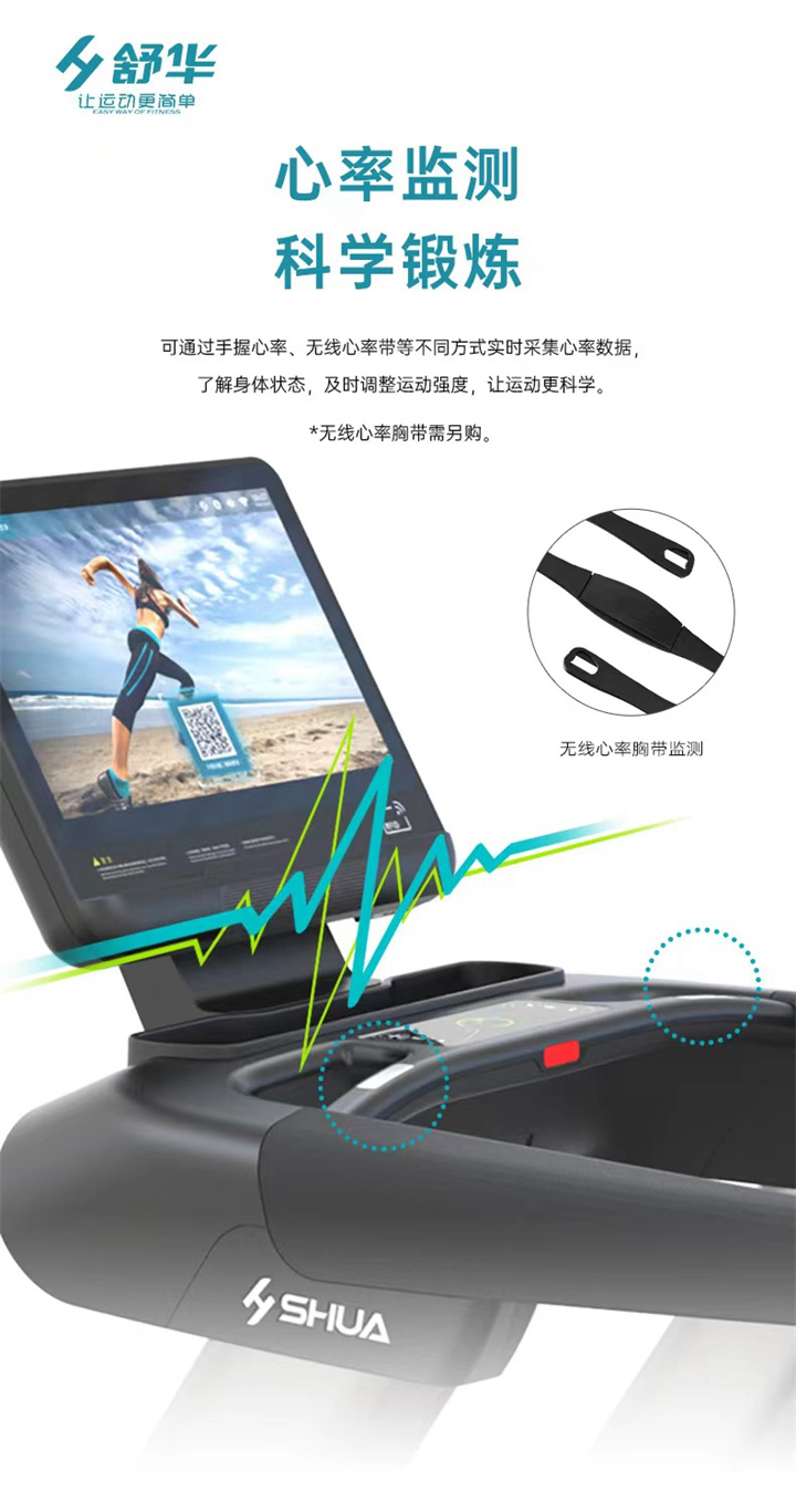 舒華商用跑步機SH-T8919采用t2.2mm黑鉆紋(可選配:t2.4免維護跑帶)的跑帶,,選用手握心率測試 自帶心率帶及增加心率控速(HRC)程序模塊、接觸式心率感應(yīng)測量心跳等數(shù)據(jù),跑步面積達580×1570mm,可承受180kg的使用者使用。